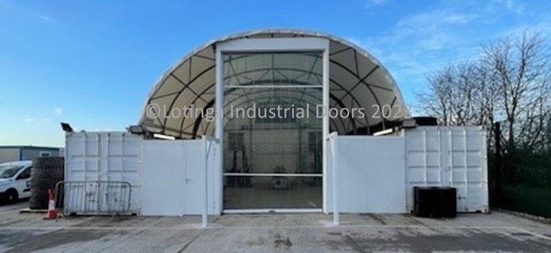 This temporary PVC door project incorporates an Eco-Strip door, a steel personnel door and a self-supporting frame.