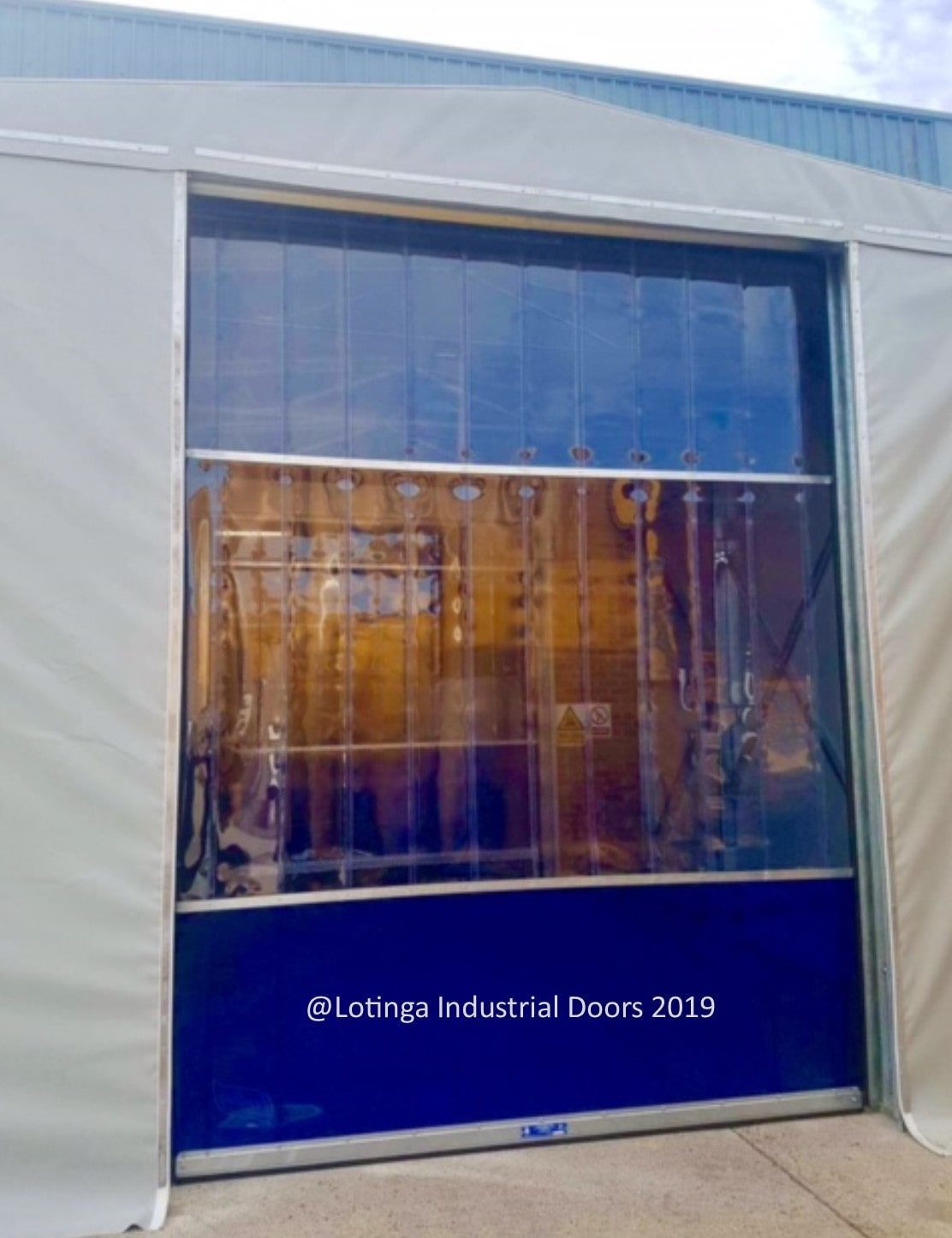 This fast action industrial door is our own design and exclusive to Lotinga. It is known as the Eco-Strip Door. You can find out more about this door by clicking here. It comes in a range of curtain colours, and you can have it personalised with your logo.